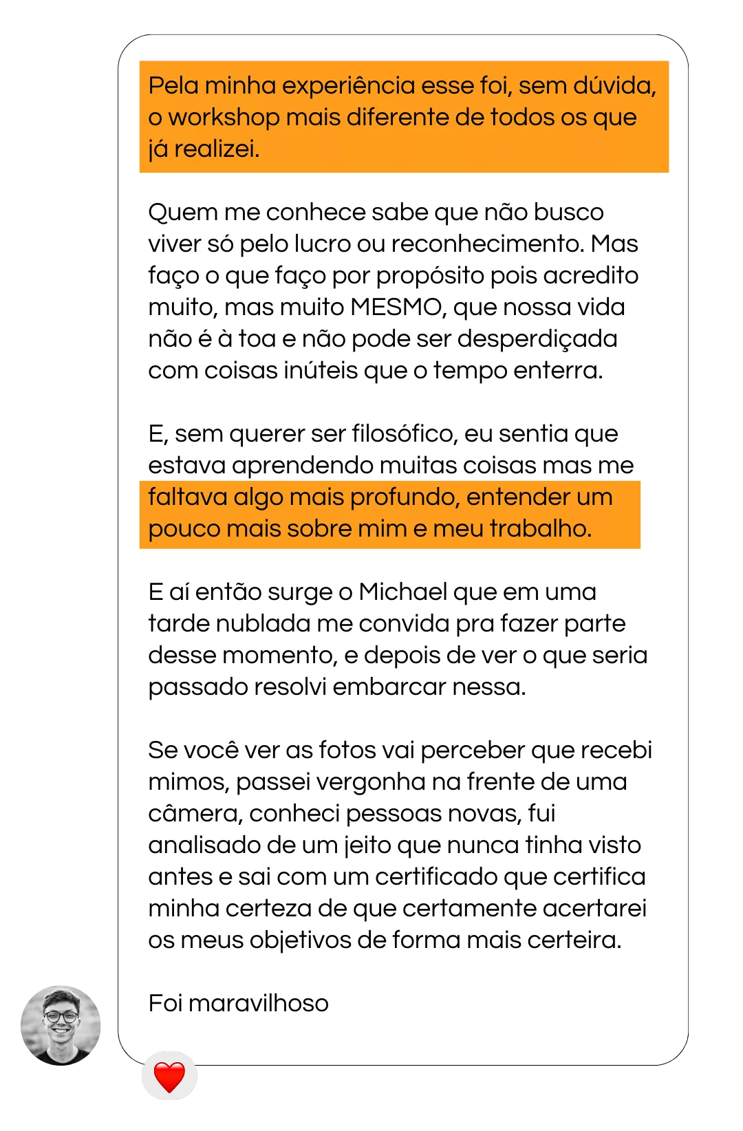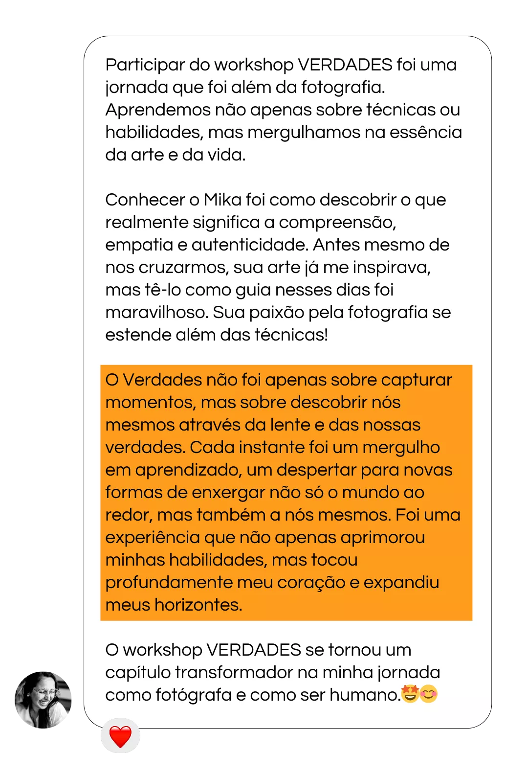 "Cada detalhe tornou este workshop não apenas educativo, mas também um mergulho profundo em minha própria criatividade e pessoa interior. O workshop me tornou assim: única, autêntica e VERDADEIRA."